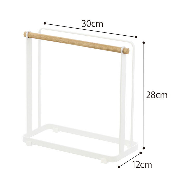 SIZE サイズ 外寸:約W31×D12×H28cm 材質 本体:スチール(粉体塗装) バー:天然木 ストッパー:シリコーン 耐荷重 約6kg 対応サイズ 厚み約2.5cmまでの珪藻土バスマット 備考 付属品:底面クッション×4個 珪藻土バスマット用クッション×10個