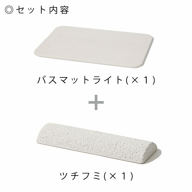 珪藻土の持つ優れた吸水性で、湯上りの濡れた足の裏の水分をすばやく吸い取ってくれる「バスマットライト」と、心地よい刺激が足の裏に伝わる掻き落とし仕上げで作られた「ツチフミ」のセットになります。