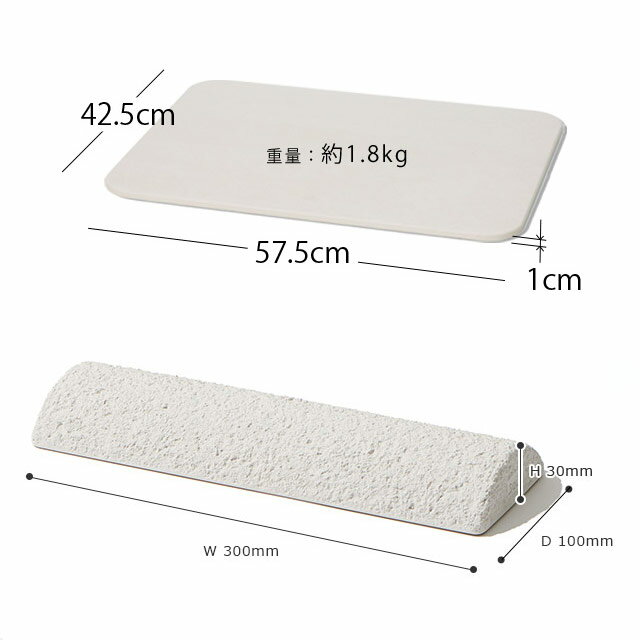 サイズ バスマットライト:W57.5 × D42.5 ×H1(cm) ツチフミ:W300 × D100 × H30(mm) 材質 バスマットライト:珪藻土、パルプ(紙)繊維 ツチフミ:秋田県産珪藻土 重量 バスマットライト:約1.8kg 耐荷重 ツチフミ:約100kg 生産国 日本 備考 使用頻度にもよりますが、ご利用期間の目安はおよそ2年間です。