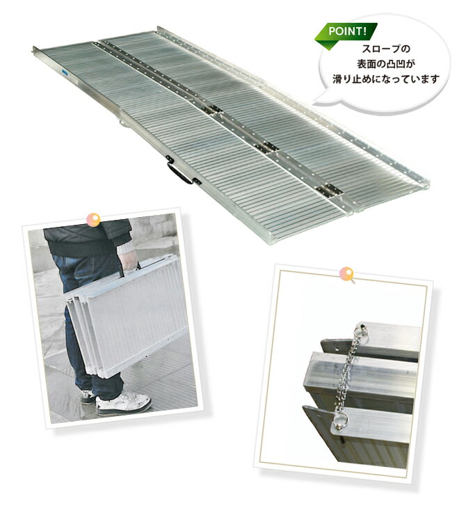 沖縄は別途送料1,500円を申し受けます ※別途送料は、ご注文後、改めてメールいたしますのでご確認ください 仕様・状態 本体重量 12.6kg 許容荷重 270kg 外寸サイズ 長さ 1520×高さ51×幅740mm(爪60mm含む) 折りたたみ時サイズ 長さ775×高さ385×幅230mm 商品説明 ◆丈夫なアルミ製スロープです(蝶番はステンレス) ◆四つ折りタイプはコンパクトになるので、自動車への積み込みや持ち運びが容易になり様々な場所で使用できます ◆コンパクトになるので保管場所を取りません ◆表面は凸凹滑り止め/サイドは脱輪防止の曲げ加工を施しています(高さ34mm) ◆全長に対して25%以下の段差でお使い下さい *本品は新品ですがインポート品となりますので製造過程や輸送途中で表面に細かい傷が入る場合がございます 使用上問題はございませんので、あらかじめご了承ください 【 注意 】 ・力の強さは個人差がありますので女性や力が弱い方は二人以上で作業してください ・アルミスロープの扱いは本体重量をよく確認してお使いください ・車いす専用ですので、その他台車等には使用しないで下さい *サイズや重量をよくご確認の上お間違いのないようご注文をお願いいたします 商品の返品・交換は一切受け付けておりませんのでご了承ください ※本品は西濃運輸での発送となります 運送会社の諸事情により配達時間指定サービスと日・祝日の配達は行っておりま せんのでご了承ください【適用段差の目安】 商品名/品番 自力走行 (5〜7°) 介助者必要 (10〜12°) 最大段差 (14°) ページ 車いす用スロープ600mm 二つ折り(AS-6)6cm12cm15cm ■ 車いす用スロープ900mm 二つ折り(AS-9)9cm18cm22cm ■ 車いす用スロープ1200mm 二つ折り(AS-12)12cm24cm30cm ■ 車いす用スロープ1500mm 二つ折り(AS-15)15cm30cm37cm ■ 車いす用スロープ1800mm 二つ折り(AS-18)18cm36cm45cm ■ 車いす用スロープ1520mm 四つ折り(ASO-152)15cm30cm38cm ■ 車いす用スロープ1825mm 四つ折り(ASO-182)18cm36cm45cm ■ 車いす用スロープ2125mm 四つ折り(ASO-212)21cm42cm53cm ■ 車いす用スロープ2430mm 四つ折り(ASO-243)24cm48cm60cm ■ 車いす用スロープ2740mm 四つ折り(ASO-274)27cm54cm67cm ■