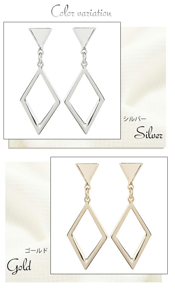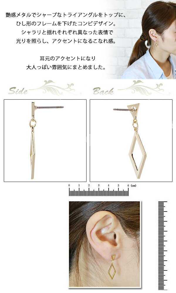 ギフト対応 素材: 真鍮製 プラチナロジウム ゴールドコーティング チタン製ポスト 日本製 サイズ: 全長:約27mm 三角モチーフ:縦約7mm 横約6mm 厚み約1mm ひし形モチーフ:縦約18.5mm 横約10.5mm 厚み約1mm ポスト:長さ約10mm 太さ約0.7mm ミニサイズトライアングル、ひし形フレームコンビの フリンジスタッドピアスです。