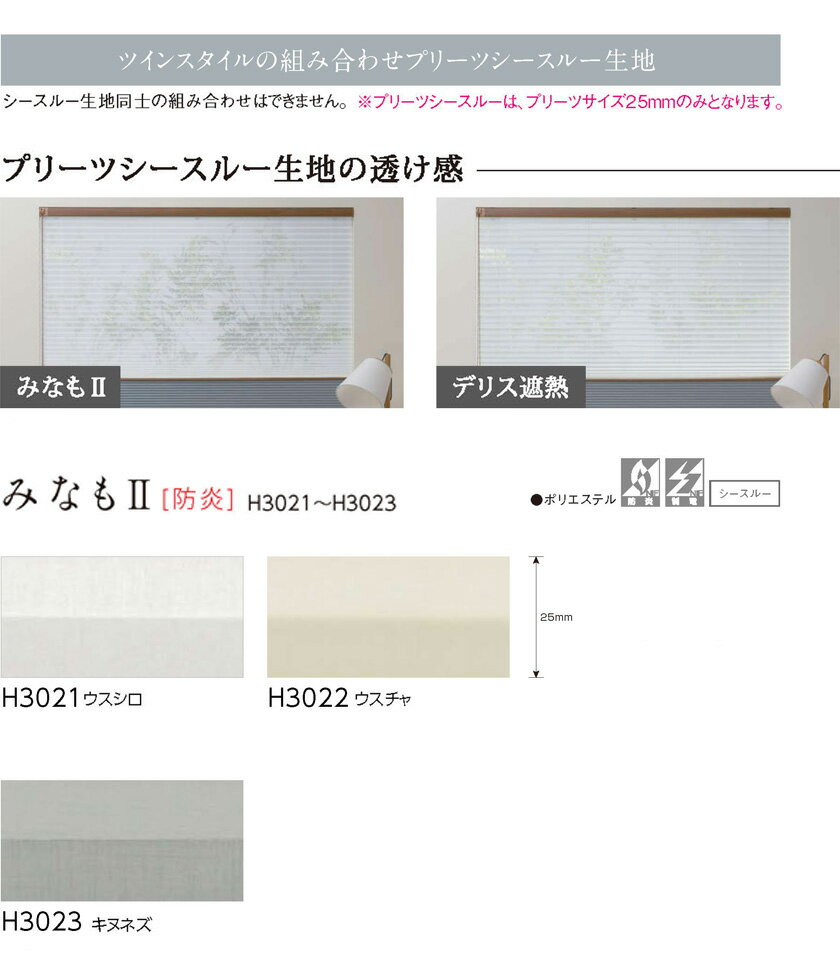 商品名ニチベイ ハニカムスクリーン レフィーナ25・45 ツインスタイルサイズセル幅25mm・45mmオーダーサイズ製作可能寸法 :コード式 幅: 25〜200cm、高さ: 30〜250cm、面積2.5m2ループコード式 幅: 50〜200cm、高さ: 30〜300cm、面積4.5m2チェーン式 幅: 50〜200cm、高さ: 30〜250cm、面積4.5m2ワンチェーン式 幅: 60〜300cm、高さ: 30〜300cm、面積4.5m2(幅、高さとも1cm間隔で製作いたします。