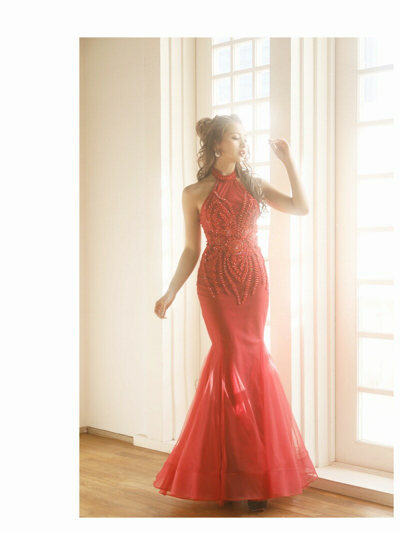 ビジュー使いが華やかなワンカラードレスはしなやかな曲線美をアピール出来る女性らしいホルターネックドレス♪