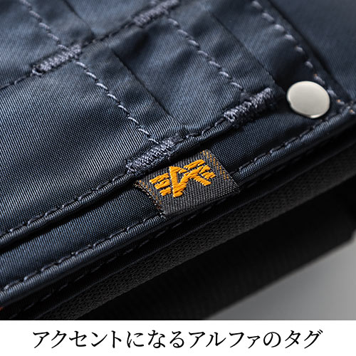 ●男性向けカジュアルブランド「ALPHA」ロゴの刺繍やブランドロゴ入りのボタンを使用しています。